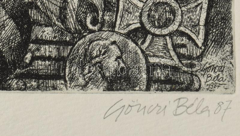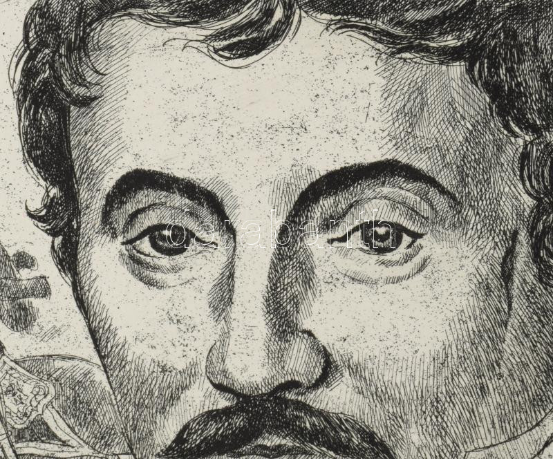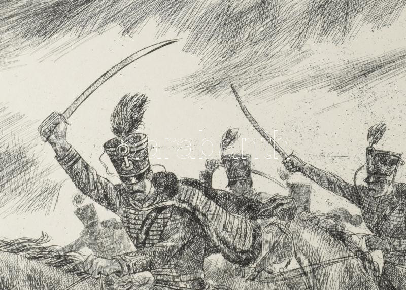 Beschreibung: Gönczi Béla (1934-): Simonyi József, "a legvitézebb huszár", 1987. Rézkarc, papír, jelzett. 29×39 cm