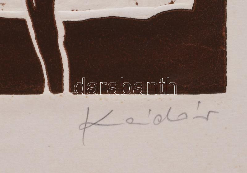 Beschreibung: Kádár György (1912-2002): Enteriőr. Linómetszet, dombornyomás, papír, jelzett, kartonra kasírozva, 34x25 cm