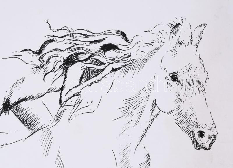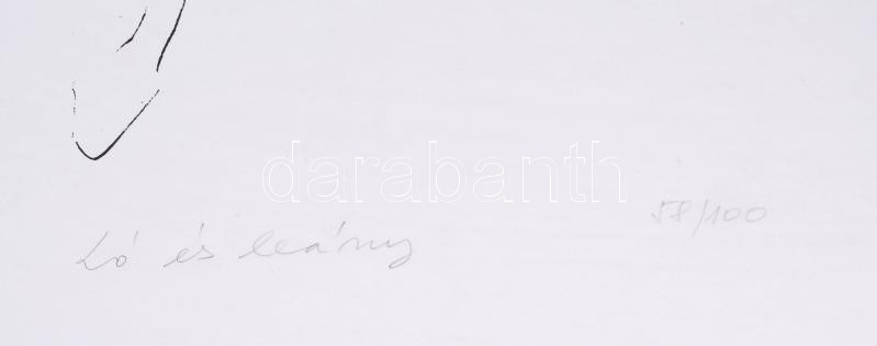 Beschreibung: Melocco Miklós (1935-): Ló és leány. Szitanyomat, papír, jelzett, számozott (58/100), kartonra kasírozva, jobb szélén ázásnyommal, 36×33 cm