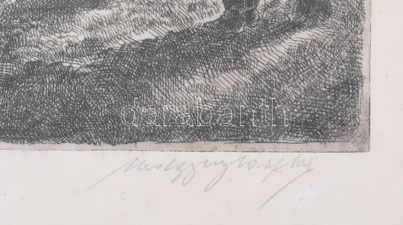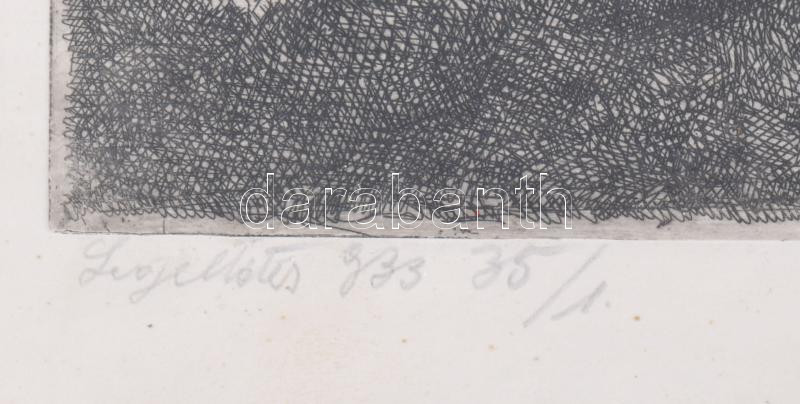 Beschreibung: Olvashatatlan jelzéssel: Legeltetés, 1933. Rézkarc, papír, jelzett. Számozott (35/1). Lap széle kissé foltos. Üvegezett fakeretben. 17,5x24 cm