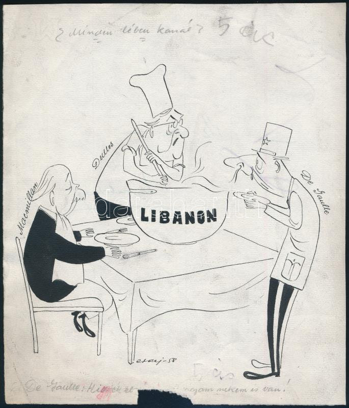 Olvashatatlan jelzéssel: Libanon - minden lében kanál (karikatúra), 19... https://www.darabanth.com/de/518-Gemalde-Plakat-ex-libris-Auktion/523.0/Gemalde-und-Grafiken/Gemalde-und-Grafiken~4/Olvashatatlan-jelzessel-Libanon-minden-leben-kanal-karikatura-1958-Tus-papir-aljan~II3519050