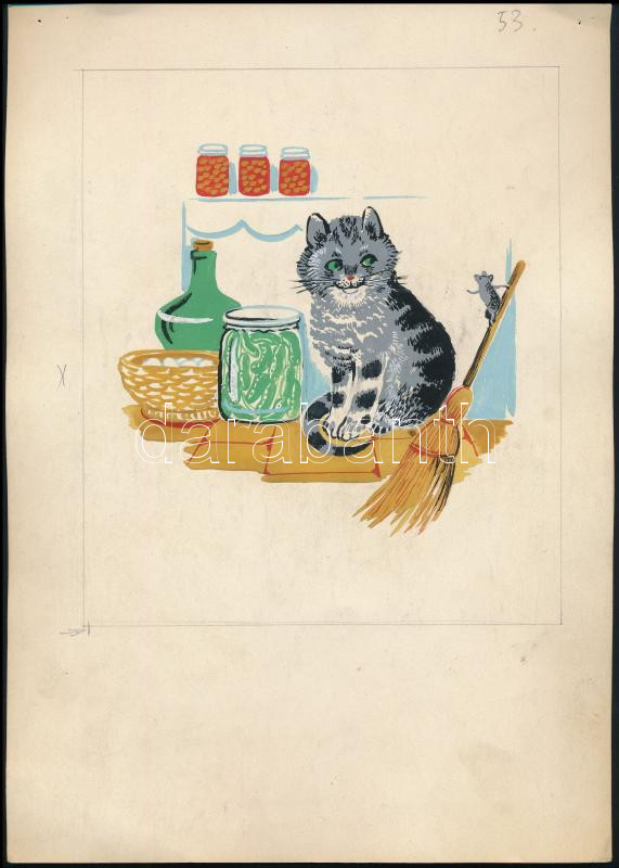 Beschreibung: Szántó Piroska (1913-1998): Macska és egér (illusztráció Kormos István Tréfás mackók c. mesekönyvéhez). Tempera, papír. Jelzés nélkül. Lapméret: 29,5×21 cm