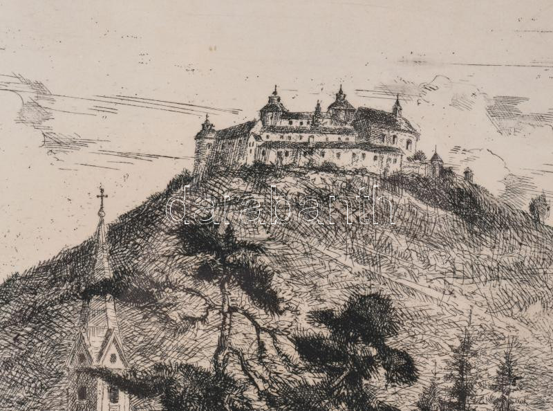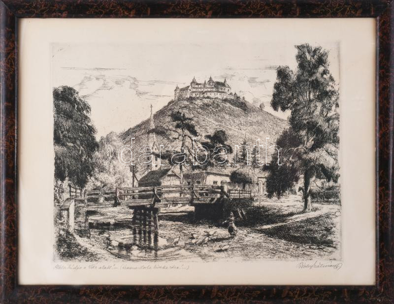 Beschreibung: Tichy Kálmán (1888-1968): Faluhídja a Vár alatt (Krasznahorka Kraszna-horka büszke vára). Rézkarc, papír, jelzett, üvegezett fakeretben. 24x31 cm.