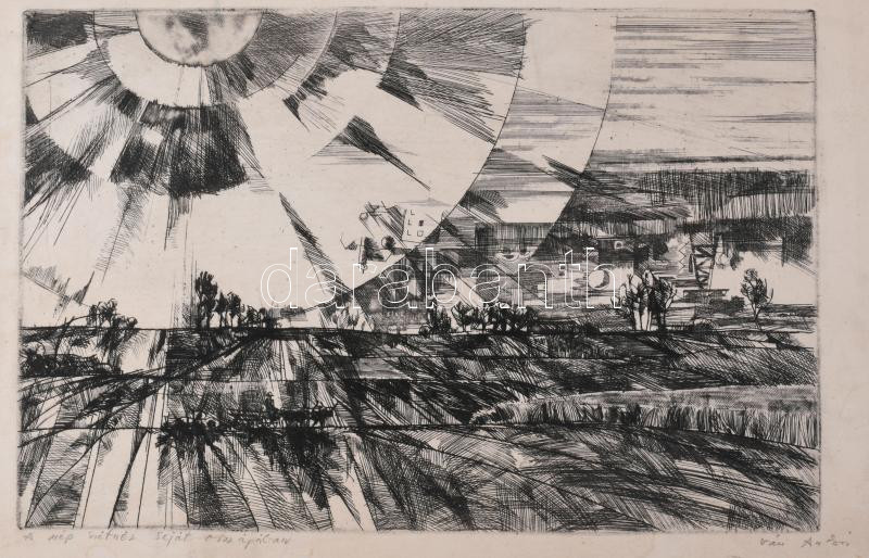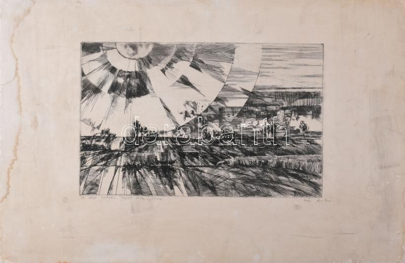 Beschreibung: Váci András (1928-1989): A nép szétnéz saját országában (Petőfi). Rézkarc, papír, jelzett, kartonon, szélé ázásnyommal, 20×29 cm