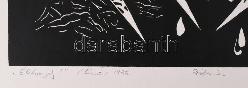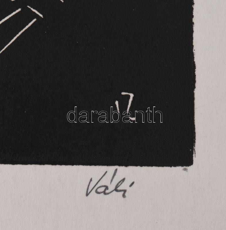 Beschreibung: Váli Zoltán (1910-1994): Életveszély!, 1976 (militária témájú grafika horogkereszt motívummal). Linómetszet, papír, jelzett. Próbanyomat próba 3 jelzéssel. Lap felső sarkaiban paszpartuzás nyomaival. 26,5x34,5 cm