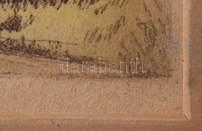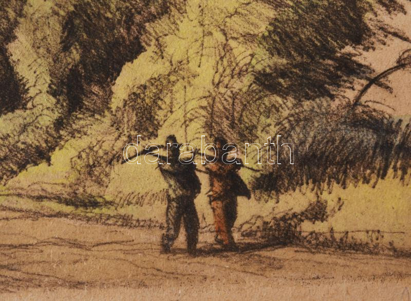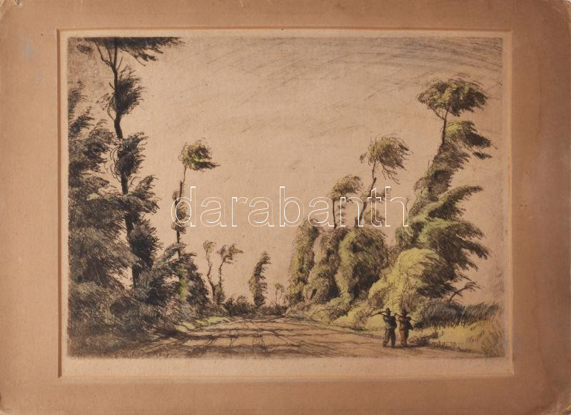 Beschreibung: Zádor István (1882-1963): Hazafelé. Színezett rézkarc, papír, jelzett (halványan), paszpartun ázásnyomokkal, 25×33 cm