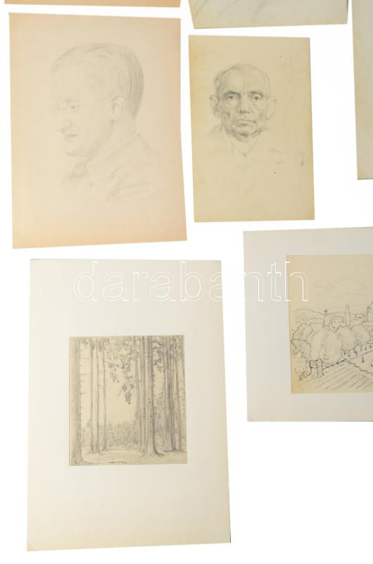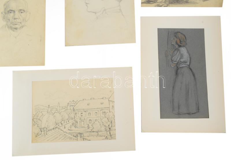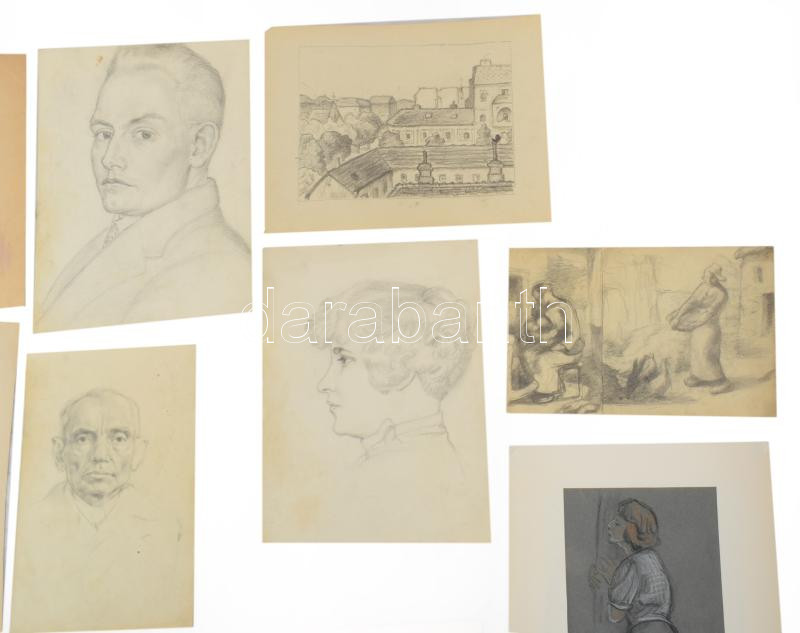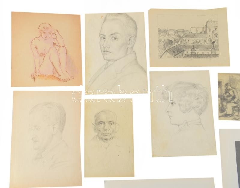 Jelzés nélkül, 1900-1930 körül: 10 db tanulmányrajz (női akt, portrék, városrészlet, stb.) Klf. technikák, papír, klf, méretekben 27x19,5 cm-ig.