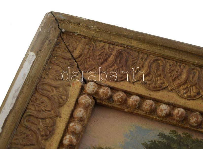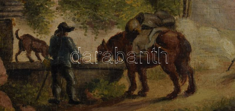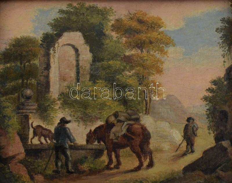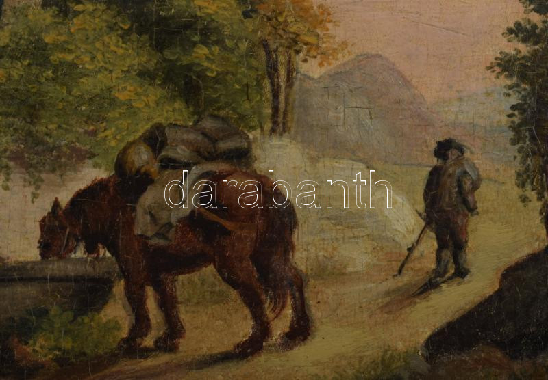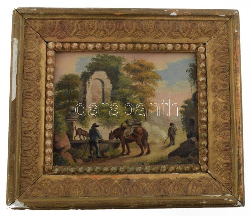 Jelzés nélkül, 1900 körül: Itatás. Olaj, fa. Hátoldalán Belvárosi Aukciósház III. Művészeti aukció (1996) raglapjával valamint nehezen olvasható felirattal (... Edouárd francia festő 1868-1940). Dekoratív, sérült fakeretben. 10x13 cm.