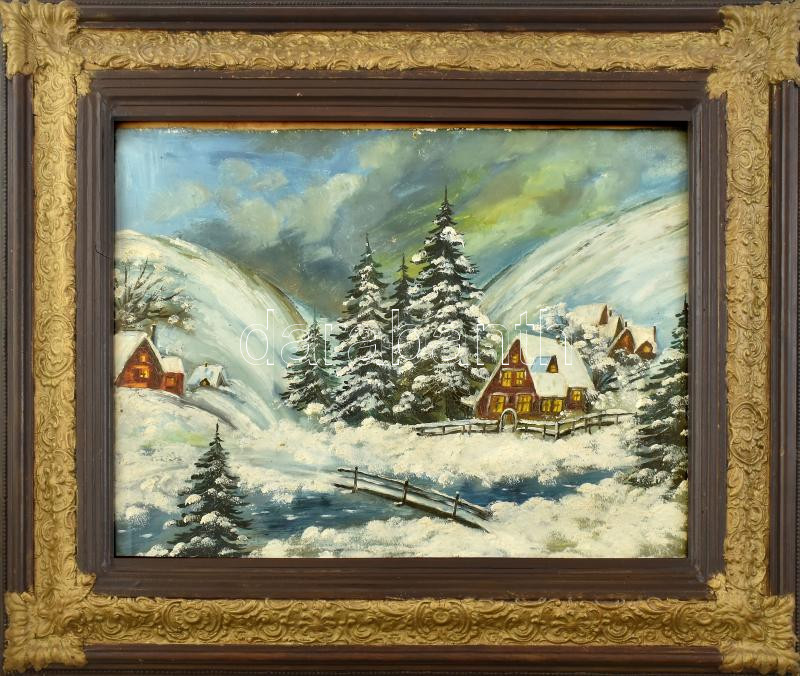 Jelzés nélkül: Havas táj. Olaj, vászon, kissé sérült. Dekoratív, üvegezett fakeretben. 36,5×48 cm.