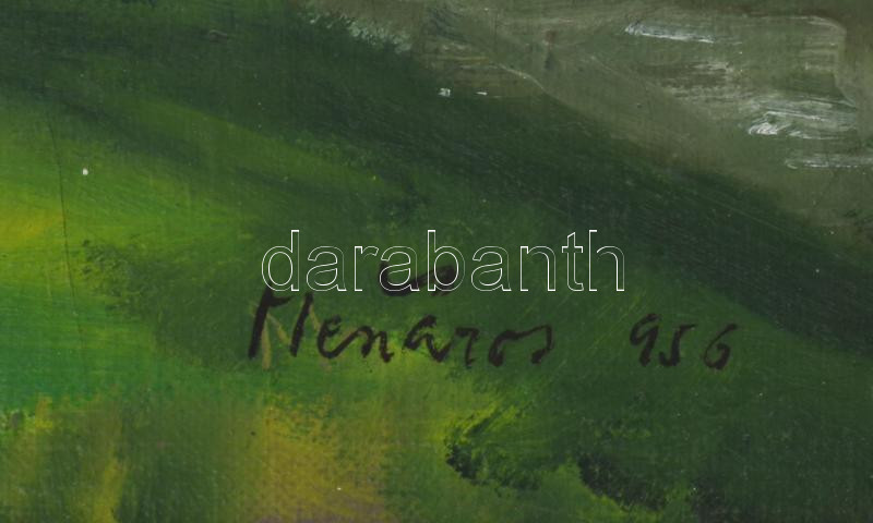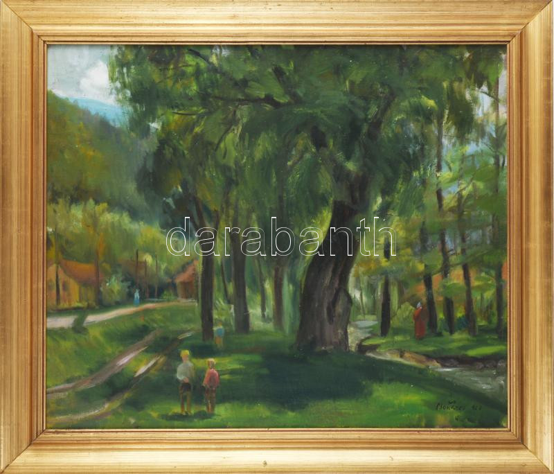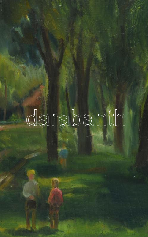 Mészáros jelzéssel: Gyerekek a patakparton, 1956. Olaj, karton. Dekoratív fakeretben. 50x60 cm