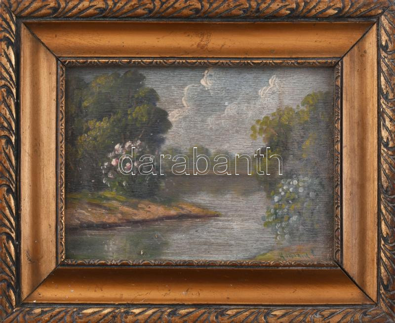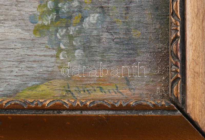 Olvashatatlan jelzéssel, XX. sz. első fele: Vízparti virágzás. Olaj, fa. Dekoratív fakeretben. 13x18 cm