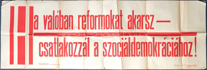 ,,Ha valóban reformokat akarsz - csatlakozzál a szociáldemokráciához" A Szociáldemokrata Párt toborzó plakátja (1933) Budapest, 1933. Világosság Rt. ny. Politikai hirdetés, mérete: 315x950 mm. A Magyarországi Szociáldemokrata Párt sorsa viharosan alakult a Tanácsköztársaság ideje alatt és után, a kommunistákkal való egyesülés ellen az MSZDP számos vezetője tiltakozott, sokuk el is hagyta az országot. Vezetőik másik részét pedig a Tanácsköztársaság bukása utáni átmeneti kormány ítélte száműzetésre. Az 1919-1920-as időszak ügyvezető kormányai ugyan jog szerint nem tiltották be az MSZDP-t, ám tagjaik és vezetőik módszeres ellehetetlenítése folytatódott. Tiltakozásképpen az MSZDP a Horthy-korszak első parlamenti választását bojkottálta. Az 1920 végi választással kormányra kerülő Bethlen István miniszterelnök a belpolitikai helyzet konszolidálására törekedett, így a rendszer erős ellenzékének számító szociáldemokraták vezetőjével 1921 decemberében egyezséget kötött (Bethlen-Peyer-paktum). Ennek jegyében a következő országgyűlési és törvényhatósági városi választásokon a MSZDP már indulhatott, választási és társadalmi programját bizonyos korlátozásokkal, de terjeszthette. Fontos kitétel volt, hogy a párttagságot közalkalmazottak, vasutasok és postások nem vehették fel, a mezőgazdasági dolgozók körében nem a párt nem agitálhatott, nem bírálhatta a hivatalos külpolitikát és nem terjeszthetett köztársasági propagandát, a sztrájkjogot pedig erősen korlátozták. Cserébe Bethlen egyfelől feloldotta a szakszervezetek és munkás egyesületek korábban zárolt bankbetéteit, és ígéretet tett a munkások társadalombiztosításának támogatására. Az MSZDP a következő választásokon (1922, 1926, 1931) - a választójogi korlátozásokat figyelembe véve - tűrhetően szerepelt, és 25, 14 és ismét 14 képviselőt küldhetett az országgyűlésbe, a budapesti törvényhatósági választásokon pedig jól szerepelt, és ez csökkentő tendenciával, de a német megszállásig (1944) így is maradt. 1933-ból származó plakátunk arról tanúskodik, hogy a szociáldemokrata párttagság felvételét illető kormányzati szigor ebben az időben kissé enyhült, plakátunk alsó sarkában az agitációs plakát engedélyeztetési szövege: ,,125/1933. sz. Ezen hirdetménynek terjesztését engedélyezem. A polgármester helyett Szepesváry tanácsnok. Budapest, 1933. március 7." Plakátunkon fent apró sérülések. Jó állapotú plakát, hajtogatva.