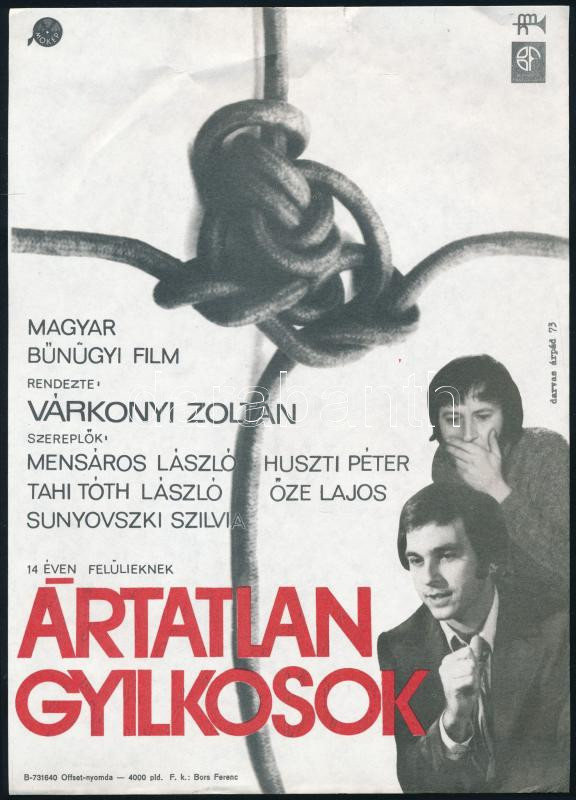 1973 Darvas Árpád (1927-2015): "Ártatlan gyilkosok", magyar bűnügyi film villamosplakátja, rendezte: Várkonyi Zoltán, szereplők: Mensáros László, Huszti Péter, Tahi Tóth László, Őze Lajos, Sunyovszki Szilvia. Bp., Offset-ny., kis szakadással, 24x17 cm