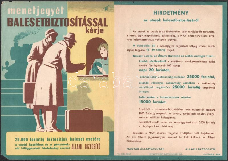 cca 1960-1970 "Menetjegyét balesetbiztosítással kérje", MÁV - Állami B... https://www.darabanth.com/de/518-Gemalde-Plakat-ex-libris-Auktion/523.0/Gemalde-und-Grafiken/Plakat~3/cca-1960-1970-Menetjegyet-balesetbiztositassal-kerje-MAV-Allami-Biztosito-reklam-plakat-~II3515112