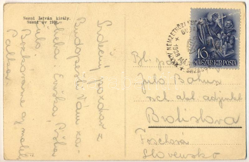 Szent István király. Szent Év 1938 / Saint Stephen, King of Hungary + "XXXIV. Nemzetközi Eucharisztikus Kongresszus Budapest 1938" So. Stpl. (fa)