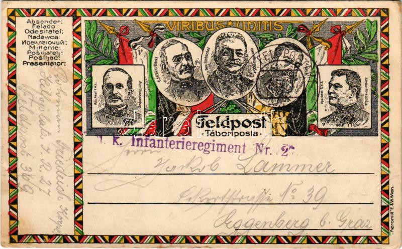 1917 Viribus Unitis Tábori Posta: Arz. v. Straussenburg, Konr. v. Hötzendorf, Viktor Dankl, Erzh. Jos. Ferdinand, Kövess v. Kövessháza - Első világháborús katonai lap / WWI Austro-Hungarian K.u.k. military, leaders, Feldpost (non PC) (EK)
