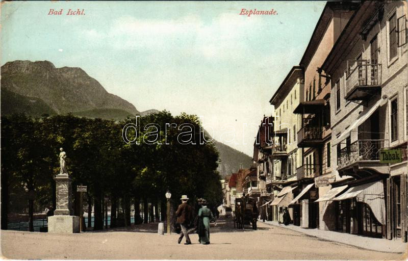 Bad Ischl, Esplanad, Tabak. Photochromiekarte No. 269. / 1909 / promenade, shops (worn corners)