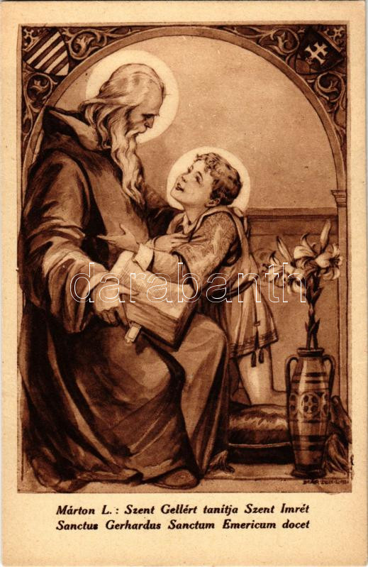 Szent Gellért tanítja Szent Imrét. Készüljetek a Szent Imre Év méltó megünneplésére! 1030-1930 / Saint Gerard with Saint Emeric of Hungary s: Márton L. (gyűrődés / crease)