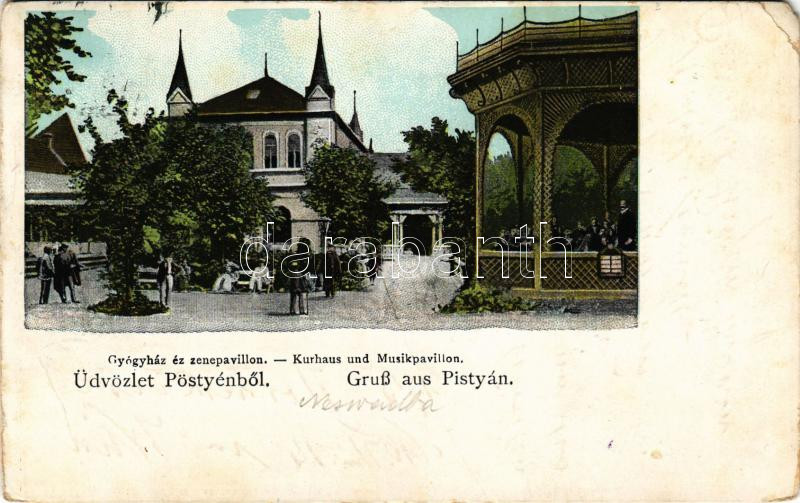 1912 Pöstyén, Piestany; Gyógyház és zenepavilon zenekarral. Gipsz H. kiadása / Kurhaus und Musikpavillon / spa hall and music pavilion with musicians (EM)