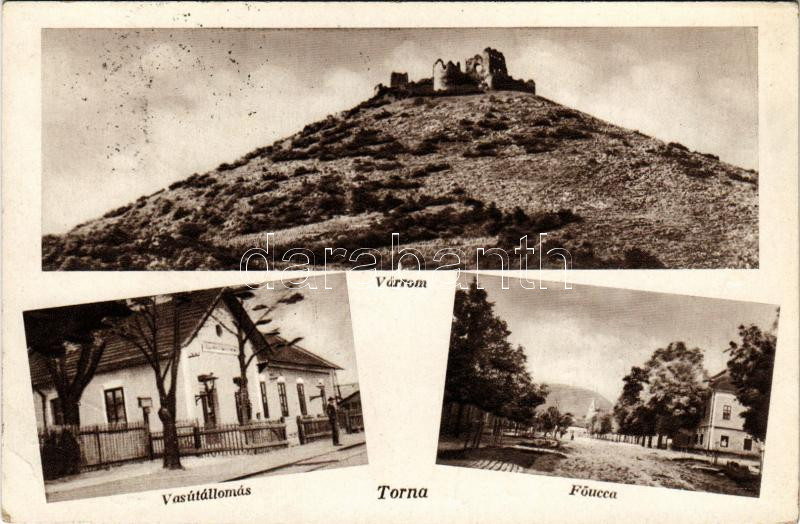 1939 Torna, Turna nad Bodvou, Turnau; vasútállomás, Fő utca, várrom. Özv. Glanc Lipótné kiadása / railway station, castle, main street (EB)