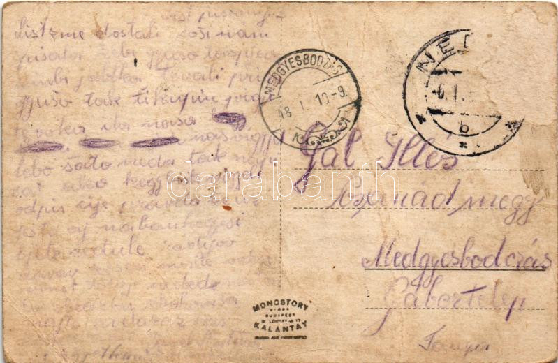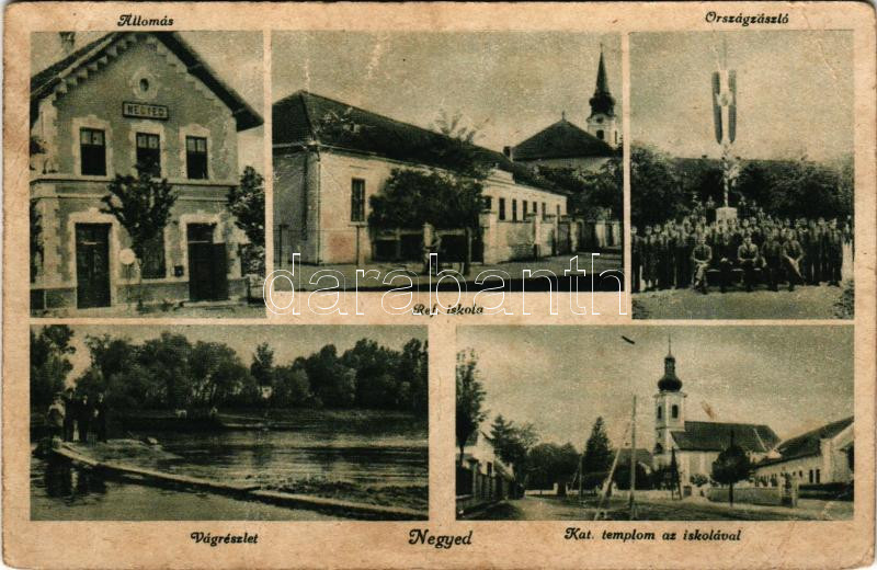 1948 Negyed, Neded; Vasútállomás, Vág részlet, Református iskola, Katolikus templom és iskola, országzászló / railway station, Váh river, Calvinist school, Catholic church and school, Hungarian flag (Rb)