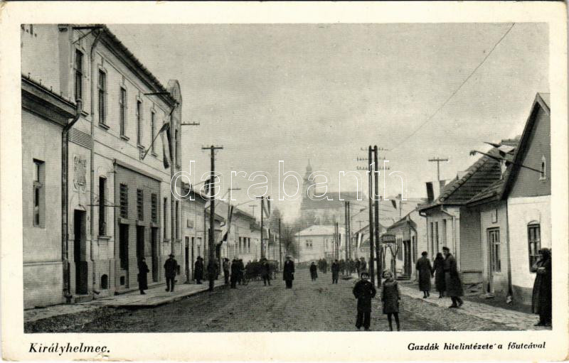 Királyhelmec, Helmec, Kralovsky Chlumec; Fő utca, Gazdák Hitelintézete, patika, gyógyszertár. Nebenzahl kiadása / main street, Farmers Credit Institute, pharmacy (EK)