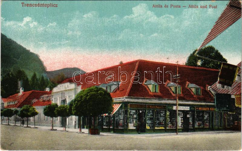 Trencsénteplic, Trencianske Teplice; Attila ház és posta, Muskáth Miksa, Ondreicska Fábián és Gyem. Elemér üzlete. Ondreicska Fábián saját kiadása / shops, post office, publisher's shop (EK)