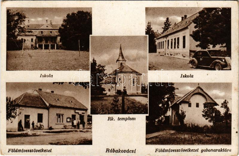 1954 Rábakovácsi, iskola, római katolikus templom, Födlmívesszövetkezet és gabonaraktára. Özv. Horváth Richárdné kiadása (EK)