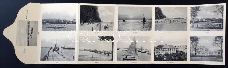 Balatonfüred, Emléklap Balatonfüredről. 6-részes kihajtható leporellólap villasorral, kikötővel, stb. Koller Károly (fa)