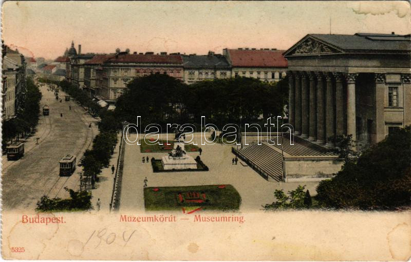 Budapest VIII. Múzeum körút, Nemzeti Múzeum, villamosok, képeslapfüzetből. Taussig Arthur 5325. (gyűrődések / creases)