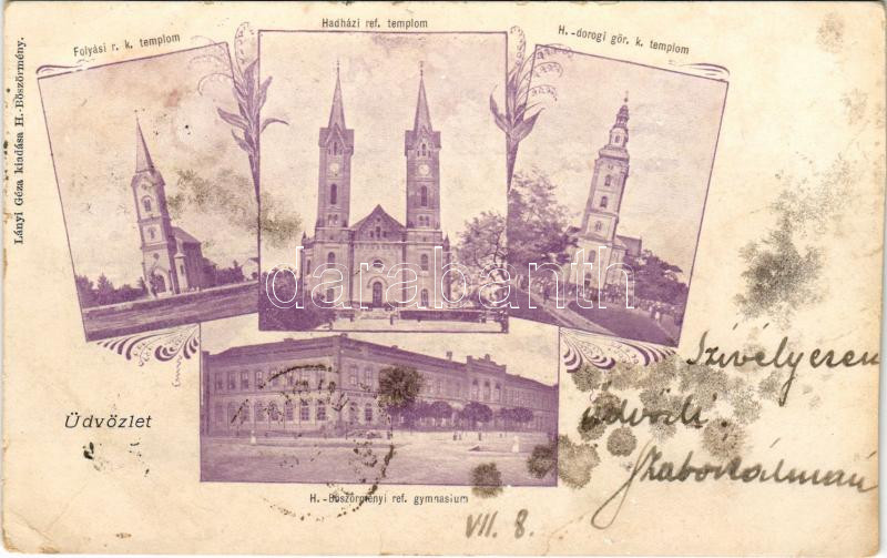 Hajdúböszörmény, Református gimnázium, Római katolikus templom (Folyás), Református templom (Hajdúhadház), Görögkatolikus templom (Hajdúdorog). Lányi Géza kiadása. Art Nouveau, floral (vágott / cut)