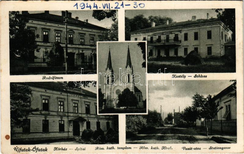 1944 Futak, Futtak, Futog; Rudolfinum, Hadik kastély, Kórház, Római katolikus templom, Vasút utca / Schloss, Röm. kath. Kirche, Spital, Stationgasse / school, castle, hospital, Catholic church, railway station (vágott / cut)