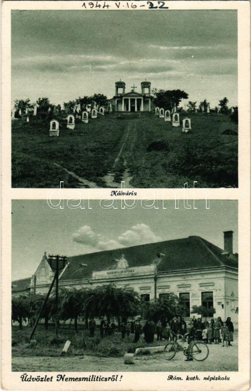 1944 Nemesmilitics, Svetozar Miletic; Kálvária, római katolikus népiskola. Mátyus Tamás kiadása / calvary, school (EK)