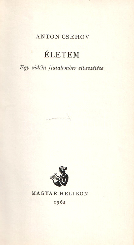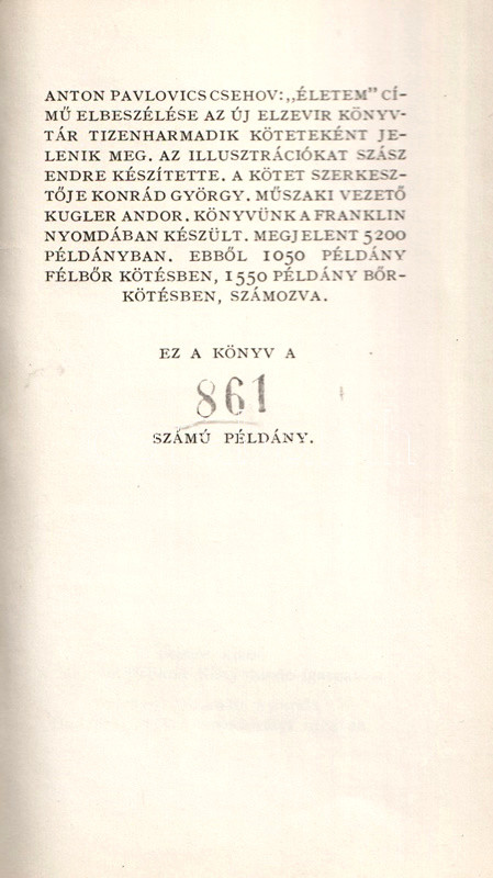 Könyvgyűjtők számára készült, számozott, bibliofil kiadás. Kolofon: "Anton Pavlovics Csehov: "Életem" című elbeszélése az Új Elzevir könyvtár tizenharmadik köteteként jelenik meg. Az illusztrációkat Szász Endre készítette. A kötet szerkesztője Konrád György. Műszaki vezető Kugler Andor. Megjelent 5200 példányban, ebből 1050 példány félbőr kötésben, 1550 bőrkötésben, számozva. Ez a könyv a 861. számú példány."