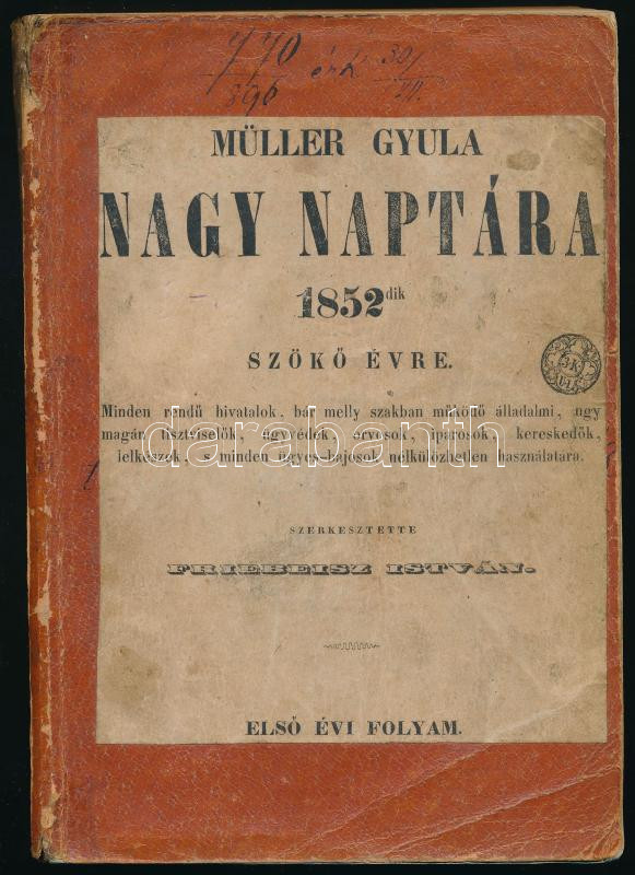 Friebeisz István (szerk.): Müller Gyula nagy naptára 1852-dik szökő évre. Minden rendű hivatalok, bár melly szakban működő álladalmi, ugy magán tisztviselők, ügyvédek, orvosok, iparosok, kereskedők, lelkészek, s minden ügyes-bajosok nélkülözhetetlen használatára. Első évi folyam. [Pest, 1852, Müller Gyula], [35] p.+ 42-310 p. (hiányos). Szövegközti fametszetű illusztrációkkal. Papírkötésben, kissé viseltes állapotban, címlap nélkül, egy sérült és több foltos lappal.