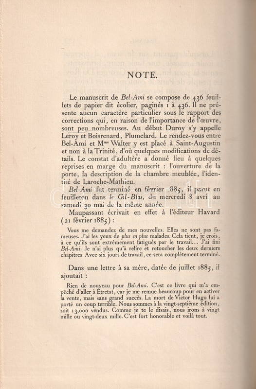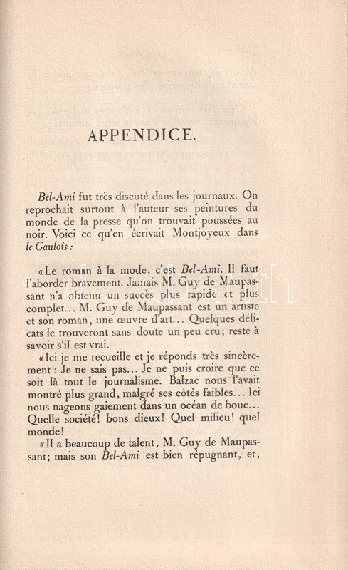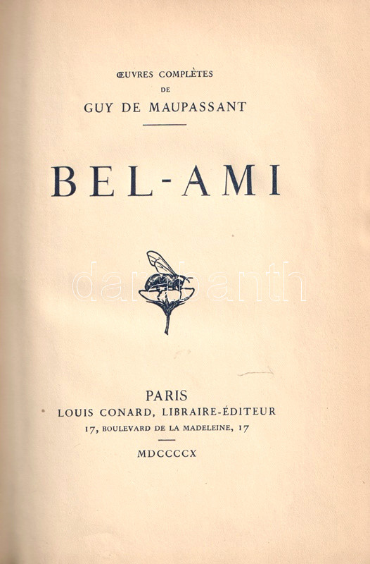 Guy de Maupassant (1850-1893) francia író, a modern novella megteremtője, a párizsi városi és a normandiai falusi, kisvárosi társadalom éles szemű megfigyelője. Egy évtizedet kitevő irodalmi karrierje során, 1881-1890 közötttöbb száz novellát és hat regényt írt. "Bel-Ami" (A szépfiú) című műve a szerző második regény terjedelmű szövege. Kiadásunkból 100 számozott példány is készült, bibliofil kötésű példányunk számozatlan.