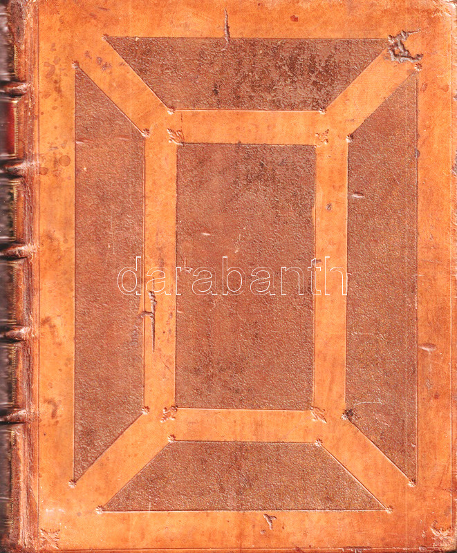 Öt bordára fűzött, díszesen aranyozott gerincű, vaknyomásos korabeli bőrkötésben, az enyhén sérült kötéstáblákon egyszeres vaknyomásos léniákból alkotott külső kerettel, beljebb ornamentikus mintákból kiinduló, egyszeres vaknyomásos léniák határolta, maratott, geometrikus mezőkkel. Dekoratív, szép példány.