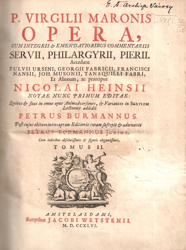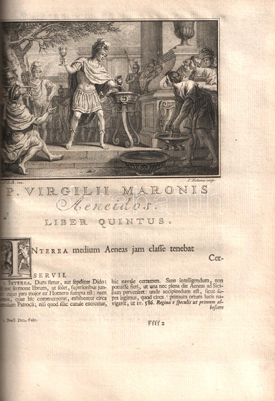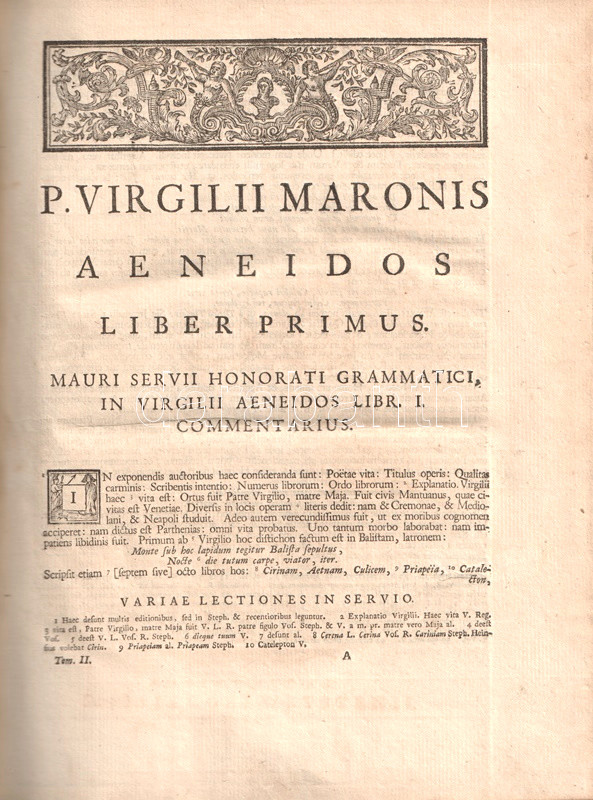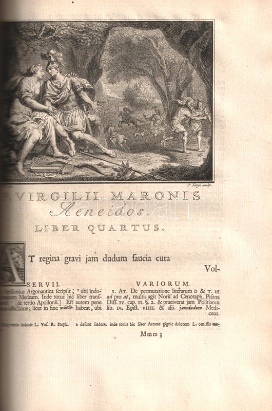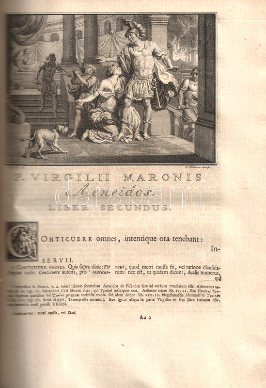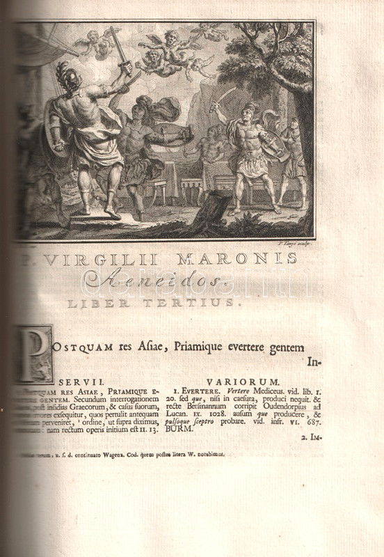 Vergilius, Publius Maro: P. Virgilii Maronis Opera, cum integris & emendatioribus commentariis Servii, Philargyrii, Pierii. Accedunt Fulvii Ursini, Georgii Fabricii, Francisci Nansii, Joh. Musonii, Tanaquilli Fabri, Et Aliorum, ac praecipue Nicolai Heinsii notae nunc primim editae. Quibus & suas in omne opus Animadversiones, & Varientes in Servium Lectiones addidit Petrus Burmannus. Post cujus obitum interruptam Editionis curam suscepit & adornavit Petrus Burmannus junior. Tomus II. [Az Aeneis I-V. énekének illusztrált, kommentált, latin nyelvű kiadása.]