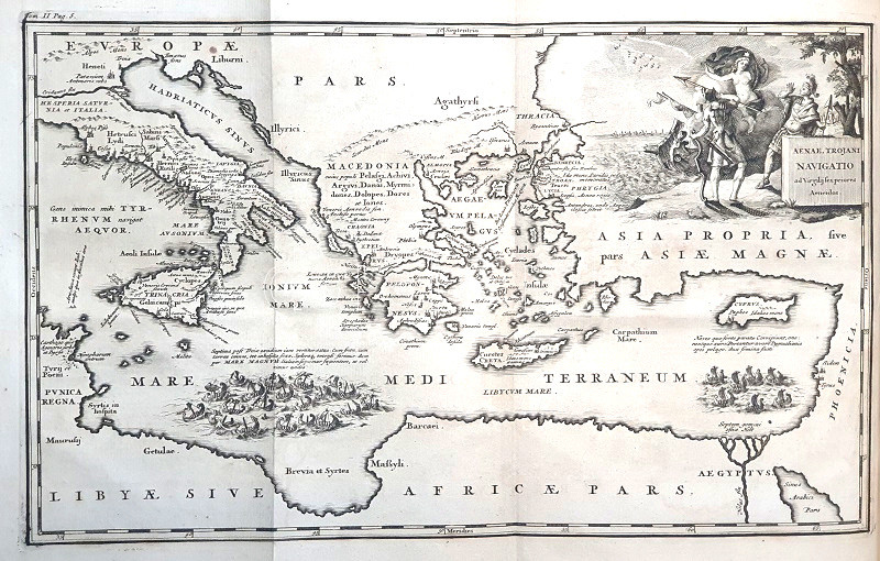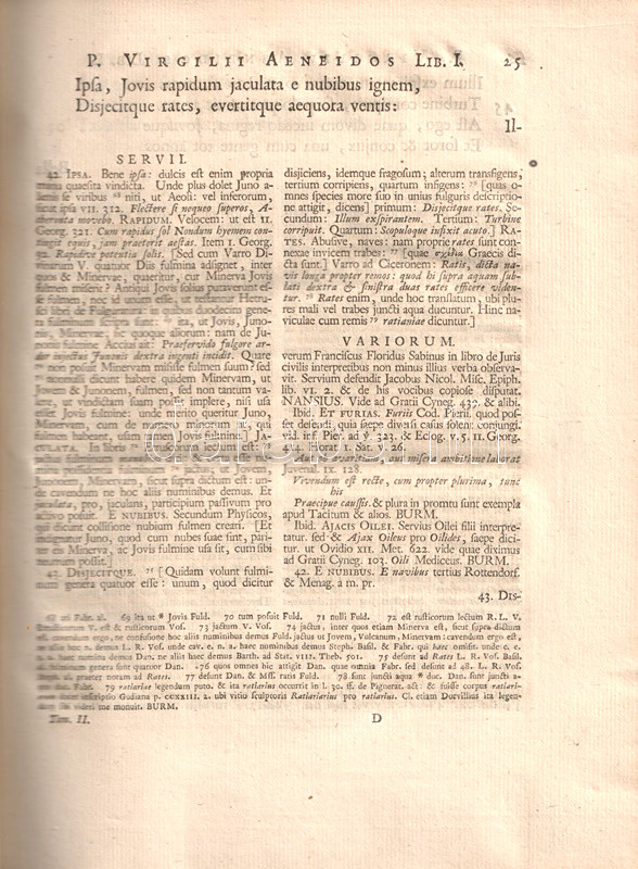 Humanista Vergilius-díszkötetünk a klasszikus és tudományos művek kiadására szakosodott amszterdami Wetsten-dinasztia nyomásában jelent meg, négykötetes Vergilius-összese részeként. Példányunk (a sorozat második kötete) az Aeneis első öt énekének igen gazdagon kommentált szövegét adja közre, kétszínnyomású, rézmetszetű nyomdászjelvénnyel, valamennyi ének előtt rézmetszetű illusztrációval, valamint az Aeneis topográfiai világát megjelenítő, kihajtható, rézmetszetű térképpel. Vergilius-kiadásunk a humanista szöveggondozás szélső értékét jelenti, valamennyi szövegoldalon egy-hat sornyi Vergilius-szöveg alatt egész oldalnyi kommentárok és magyarázatok sorakoznak.