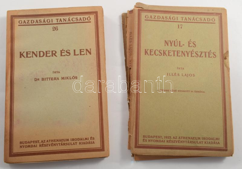 2 db - Dr. Bittera Miklós: Kender és len. Gazdasági Tanácsadó 26. Bp., Athenaeum. + Illés Lajos: Nyúl- és kecsketenyésztés. Gazdasági Tanácsadó 17. Bp., 1922, Athenaeum. Kiadói papírkötés, az egyik jó, a másik széteső állapotban.
