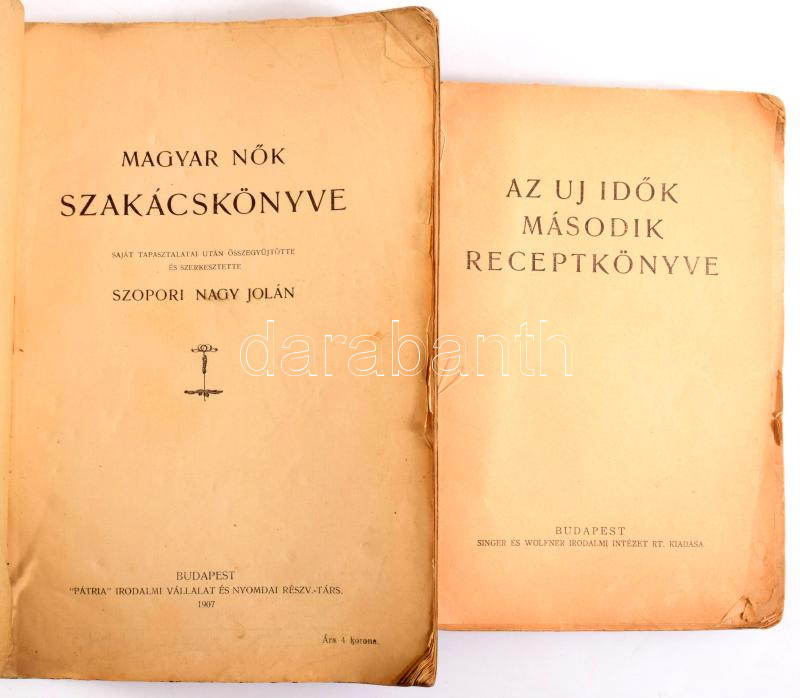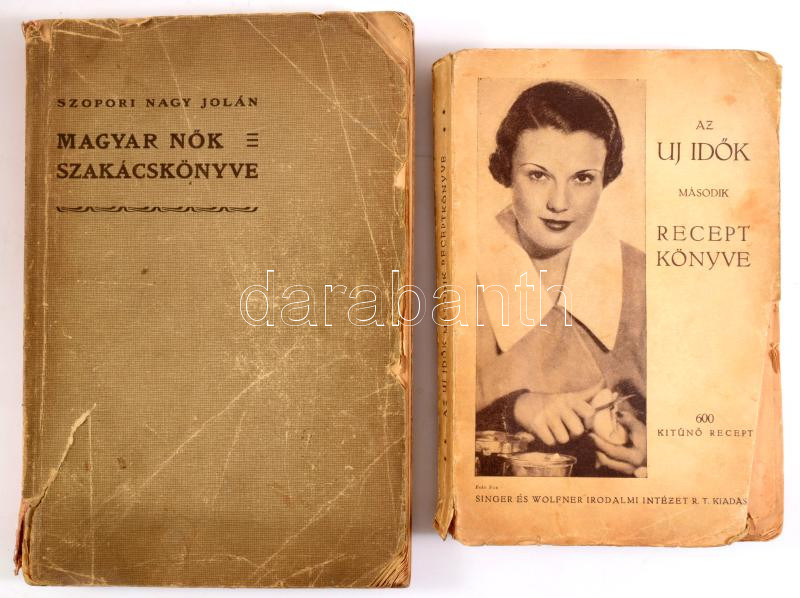 Szopori Nagy Jolán: Magyar nÅ‘k szakácskönyve. Saját tapasztalatai után összegyűjtötte és szerkesztette - - -. Bp., 1907, "Pátria", 258+8 p. Kiadói papÃrkötés, sérült borÃtóval és gerinccel, néhány foltos, viseltes (65-72 p.) lappal, néhány szamárfüles lappal, egy-két bejegyzéssel. + Az Uj IdÅ‘k második receptkönyve. Bp., 1934, Singer és Wolfner, 240 p. Kiadói papÃrkötés, sérült, foltos borÃtóval.
