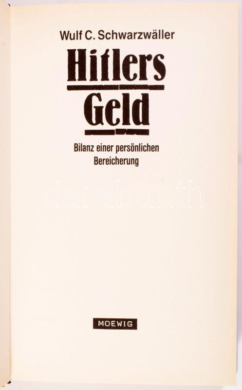 Wulf C. Schwarzwäller: Hitlers Geld. Bilanz einer perönlichen Bereicherung. Rastatt, 1986, Arthur Moewig. Német nyelven. Kiadói egészvászon-kötés, kiadói papír védőborítóban.