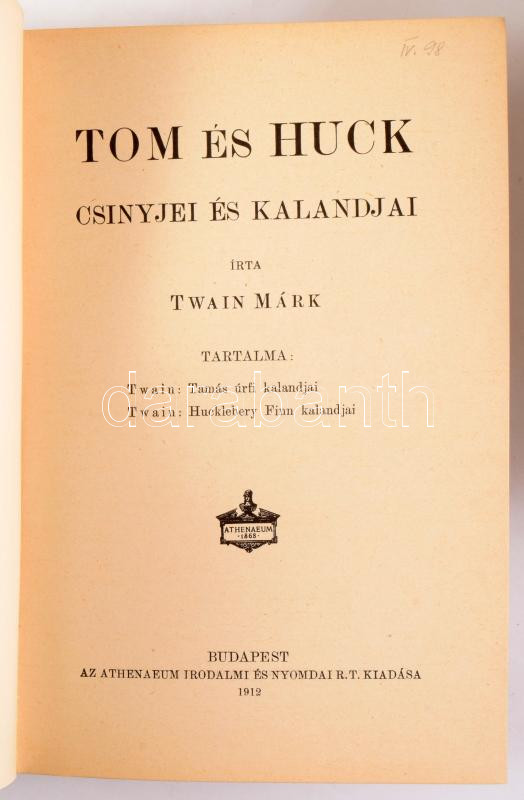 Twain, Mark: Tom és Huck csinyjei és kalandjai. + Huckleberry Finn vándorlásai és kalandjai. Bp., 1912, Athenaeum. 151+200p. Kiadói festett egészvászon kötés, jó állapotban.