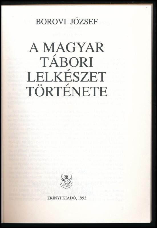 Borovi József: A magyar tábori lelkészet története. 1992, Zrínyi. 302p. Kiadói papírkötés, jó állapotban.