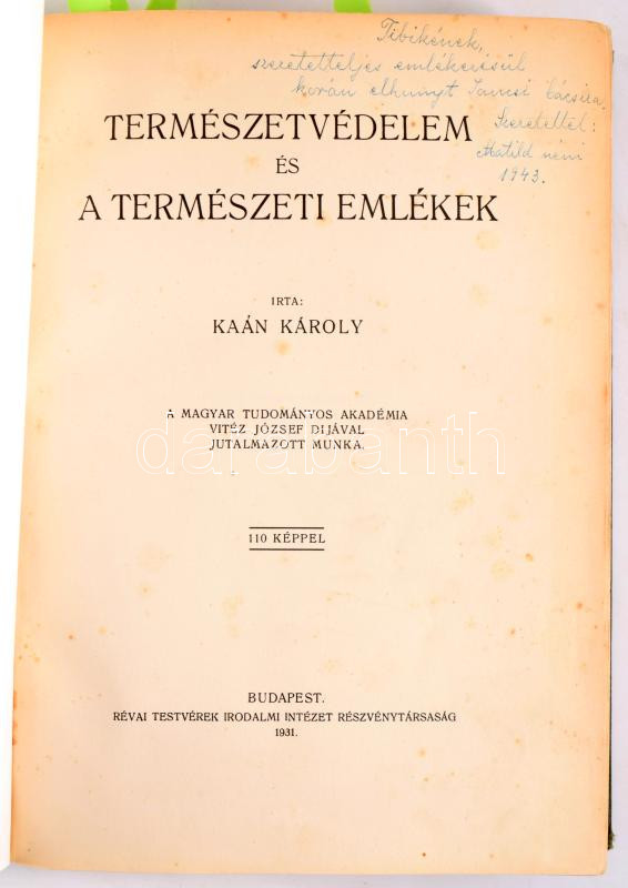 Kaán Károly: Természetvédelem és a természeti emlékek. 110 képpel. Bp., 1931., Révai, 312+2 p. Egészoldalas fekete-fehér képtáblákkal. Kiadói aranyozott egészvászon-kötésben, kissé kopott borítóval, javított gerinccel és kötéssel, ezt leszámítva jó állapotban.