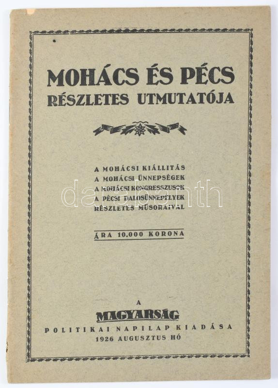 1926 Mohács és Pécs részletes útmutatója, a Magyarság politikai napilap kiadása, 32p. Kiadói papírborítóval