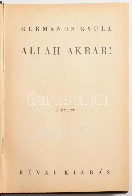 Germanus Gyula: Allah Akbar! I-II. kötet. Bp., 1936, Révai. 333+311 p + 35 t. A szerző 70 eredeti fekete-fehér fényképfelvételével, térképmellékletekkel. Kiadói egészvászon-kötés, jó állapotban.