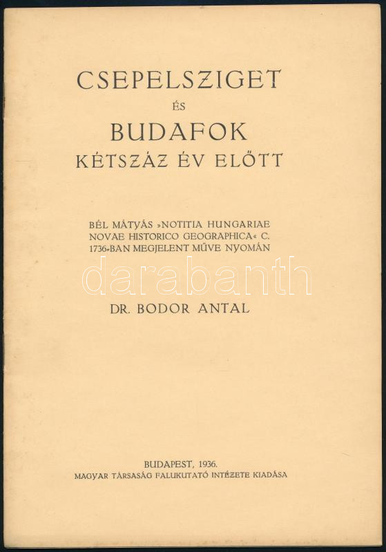 R. Bodor Antal: Csepelsziget és Budafok kétszáz év előtt. Bp., 1936, Magyar Társaság Falukutató Intézete. 13p. Kiadói foltos papírkötés.