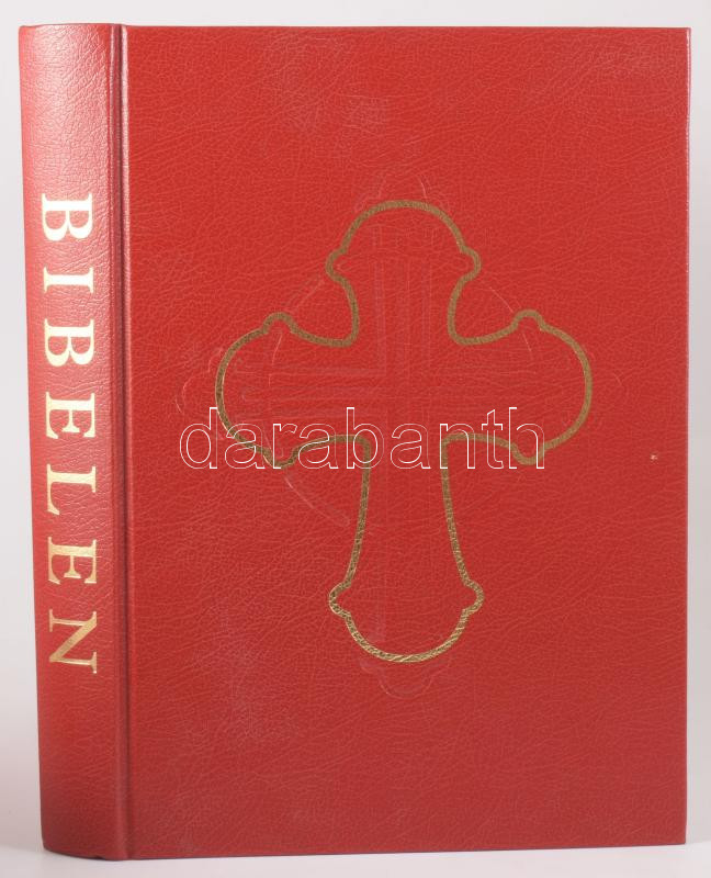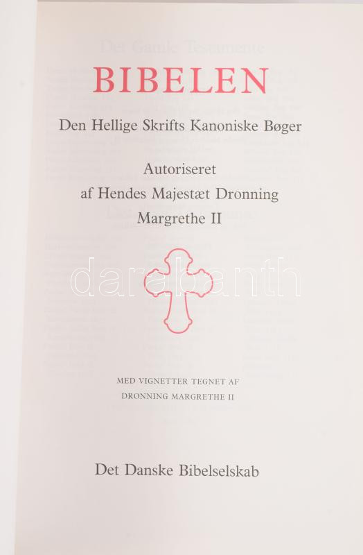 Bibelen. Den Hellige Skrifts Kanoniske Boger. Autoriset af Hendes Majestaet Dronning Margrethe II. [Dán nyelvű Biblia.] Kobenhavn, 2000, Det Danske Bibelselskab, [8]+1163+[25] p. Kiadói aranyozott egészbőr-kötés. / Bible. In Danish language. Hardcover.