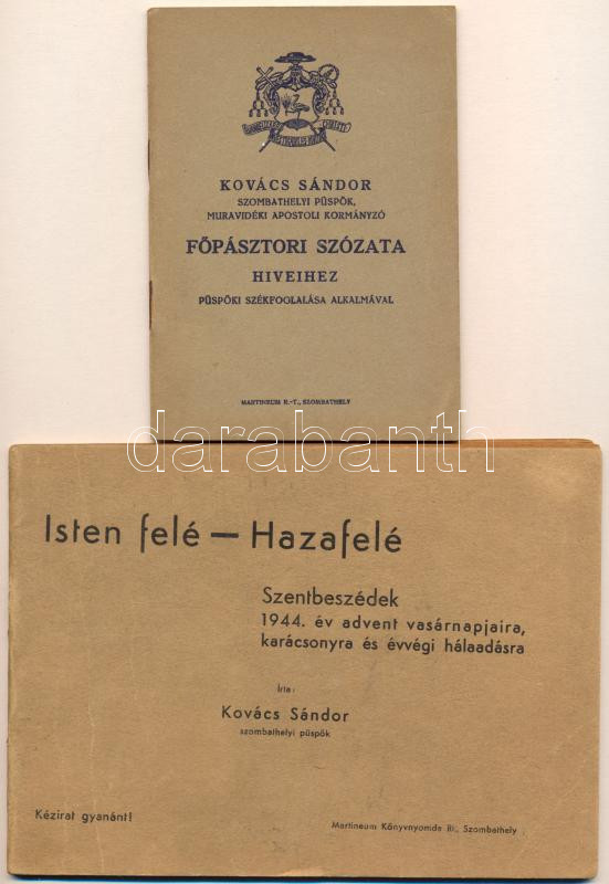 Kovács Sándor szombathelyi püspök, muravidéki apostoli kormányzó főpásztori szózata híveihez püspöki székfoglalása alkalmával. (Püspökként az első megnyilatkozása.) Szombathely, 1944, Martineum-ny., 30+1 p. Kiadói papírkötés.;